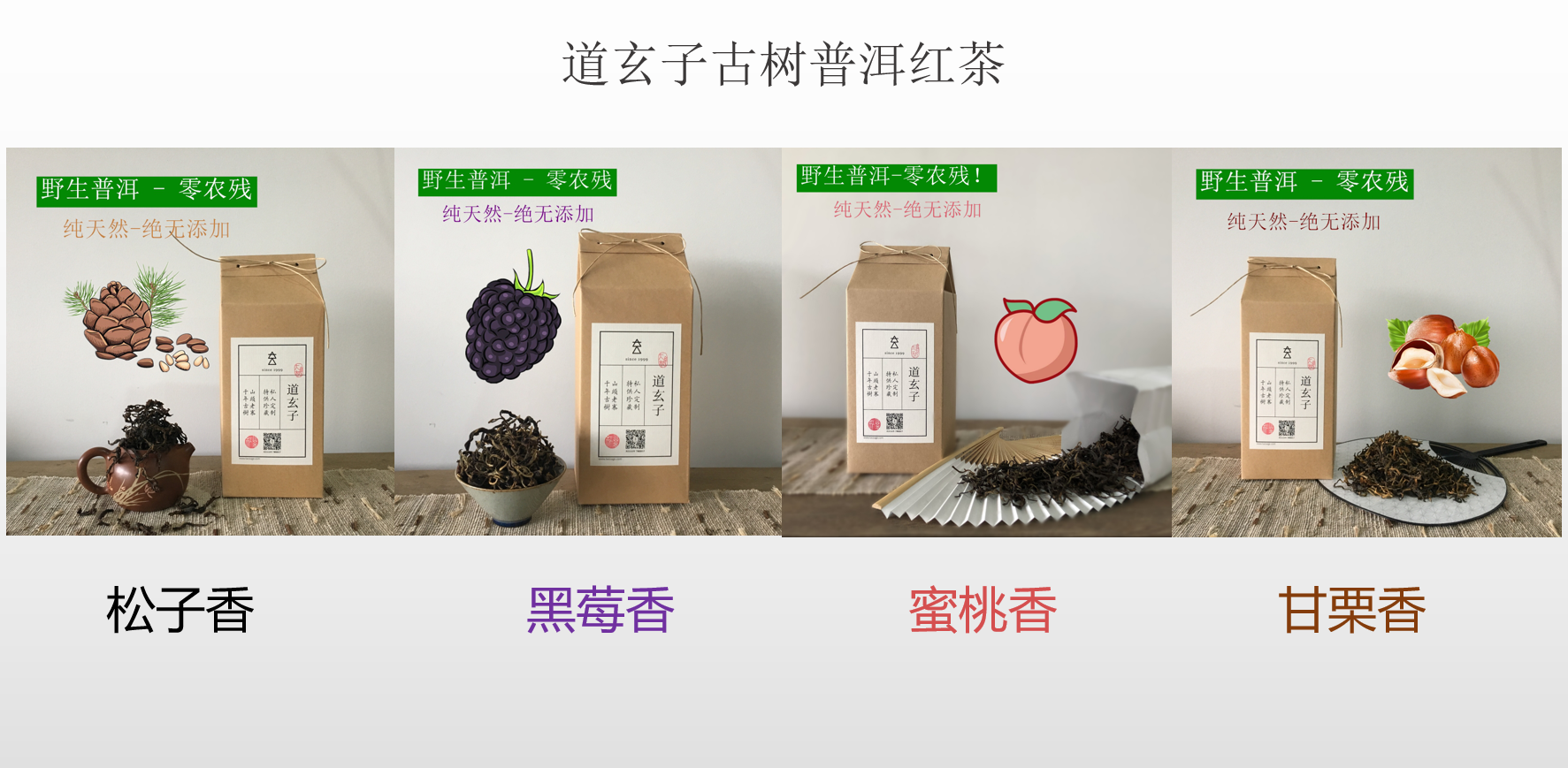 云南土地辽阔,各个山头、村寨的海拔、气候等等各有差异,这也成就了红茶的[一山一味],道玄子通过反复的试制对比品鉴,严格把控产区、采摘时间、天气、以及每棵古树的采摘量...整个制作过程严谨,将云南哈尼族人对茶性的了解,结合现代科学,根据男女口感偏向,道玄子的制茶师根据不同山头产区的茶叶特性反复试制,研发出[4款]不同口感香气的零添加古树普洱红茶(玄红),既保留了古树普洱茶丰富的内含物及营养成份等优点,又赋予了红茶的香甜醇厚!分别是松子香、黑莓香、蜜桃香、甘栗香,其中松子香、黑莓香为君子款,滋味醇厚,蜜桃香、甘栗香为淑女款,口感香甜。